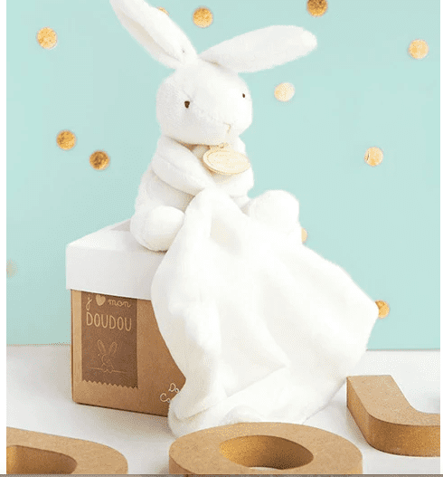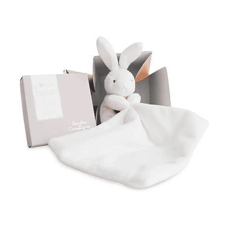 Le petit lapin blanc s'offre dans un petit coffret avec son mouchoir brodé au prénom de l'enfant.
