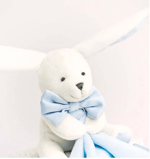 Le petit lapin bleu s'offre dans un petit coffret avec son mouchoir brodé au prénom de l'enfant.