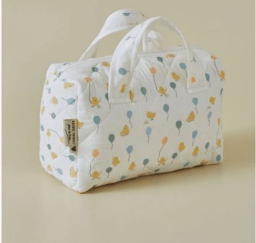 Trousse de toilette enfant Piou Piou, pratique, idéale pour ranger les produits de toilette lors des voyages ou à la maison.L'imprimé représente des poussins avec des ballons. Très rigolo à broder.